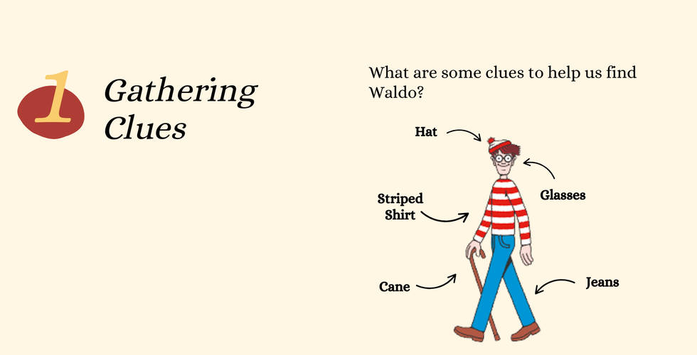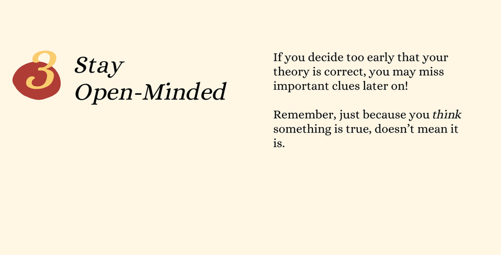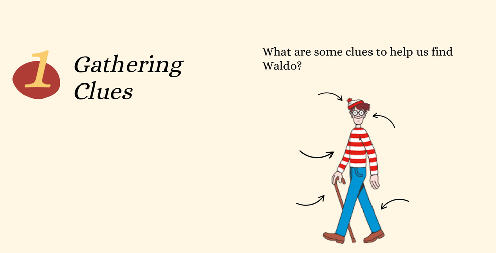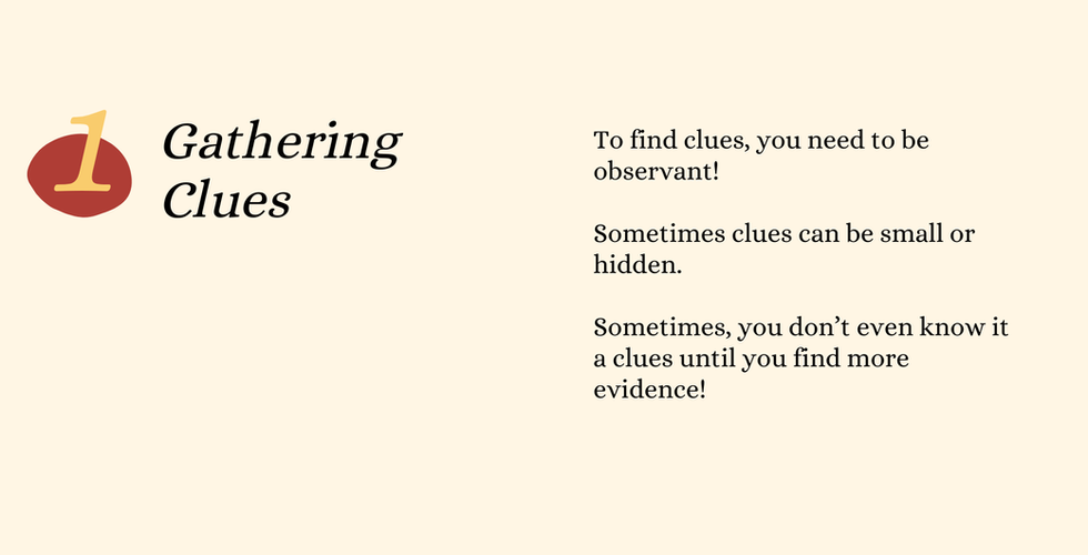 A clue is any piece of evidence used to solve a problem. The challenge for young readers is learning to look for facts before jumping to conclusions. Often, we're quick to assign meaning to facts but instead, we need to treat them first as data points. Then, once we've got enough data points, we can begin to develop a hypothesis to explore. This step is important because when we assign meaning to facts too quickly, we can put accidental blinders on what we're looking for next.